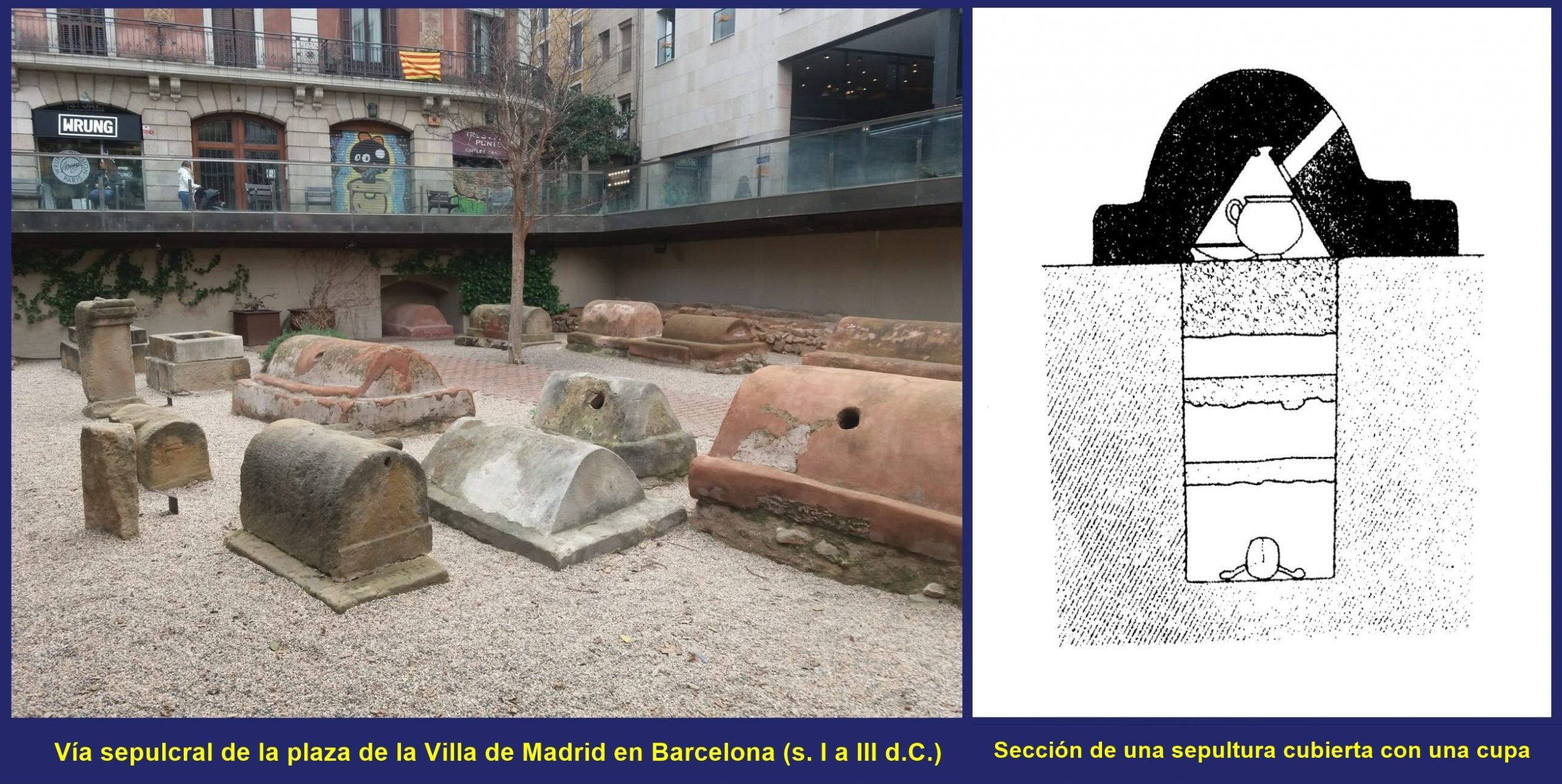 Estas tumbas responden al tipo funerario conocido como cupae structiles, muy común en el ámbito mediterráneo. Se caracterizan por ser construcciones de mampuesto y mortero que imitan la forma de un tonel tumbado (de ahí el término latín cupa), diseñadas como estructuras emergentes para ser vistas desde la vía pública. Otro ejemplo de estos tipos de tumbas las podemos encontrar en la Vía sepulcral de la plaza de la Villa de Madrid en Barcelona (s. I a III d.C.).