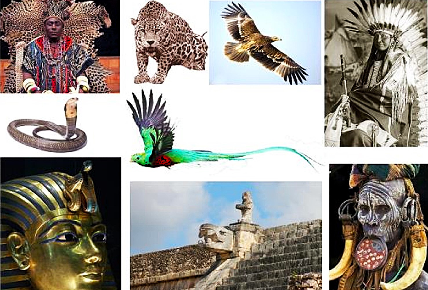 Para conseguirlo se fija en la naturaleza e imita a los animales, tomando aquellas cualidades más sobresalientes, bien su poder, su formas e imágenes, como símbolos de capacidades que representan el poder (plumas, pieles, cuernos, colmillos…), incluso creando seres nuevos que conjugan varias capacidades (el toro alado, la serpiente emplumada…). Una representación que se ha mantenido a lo largo de la historia, como la creación de seres mitológicos en las civilizaciones babilónicas, la iconografía de los evangelistas en el cristianismo, incluso hasta los tiempos actuales en el universo comercial de las marcas de coches, Ferrari (caballo), Jaguar, Seat León o el Panda.