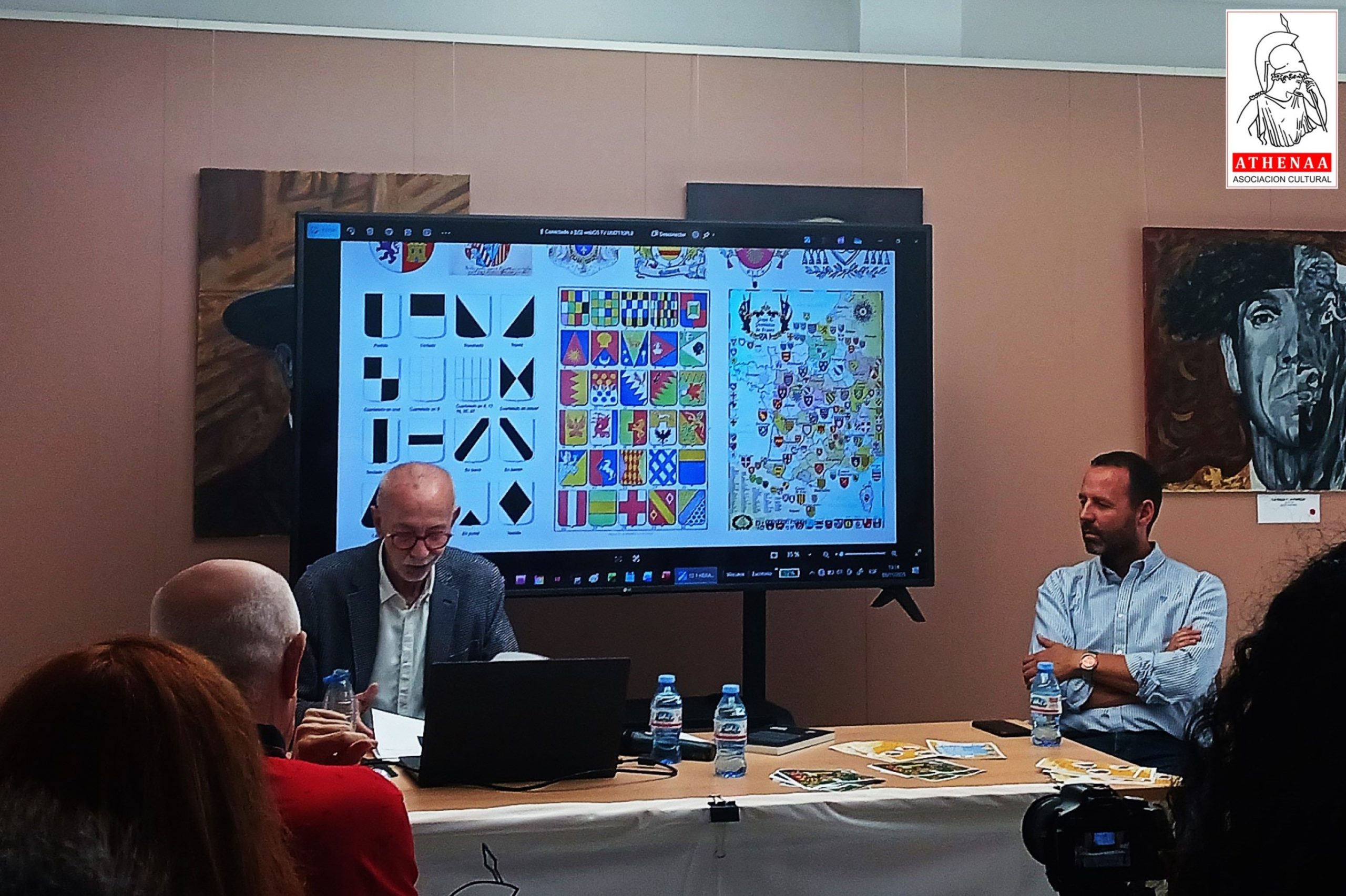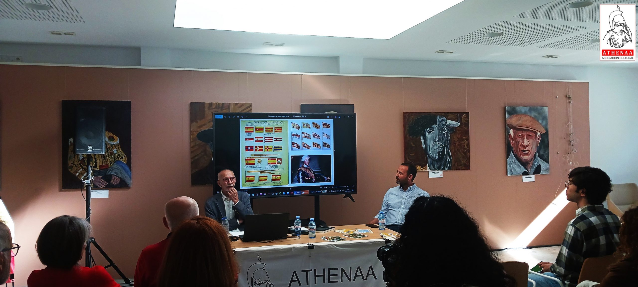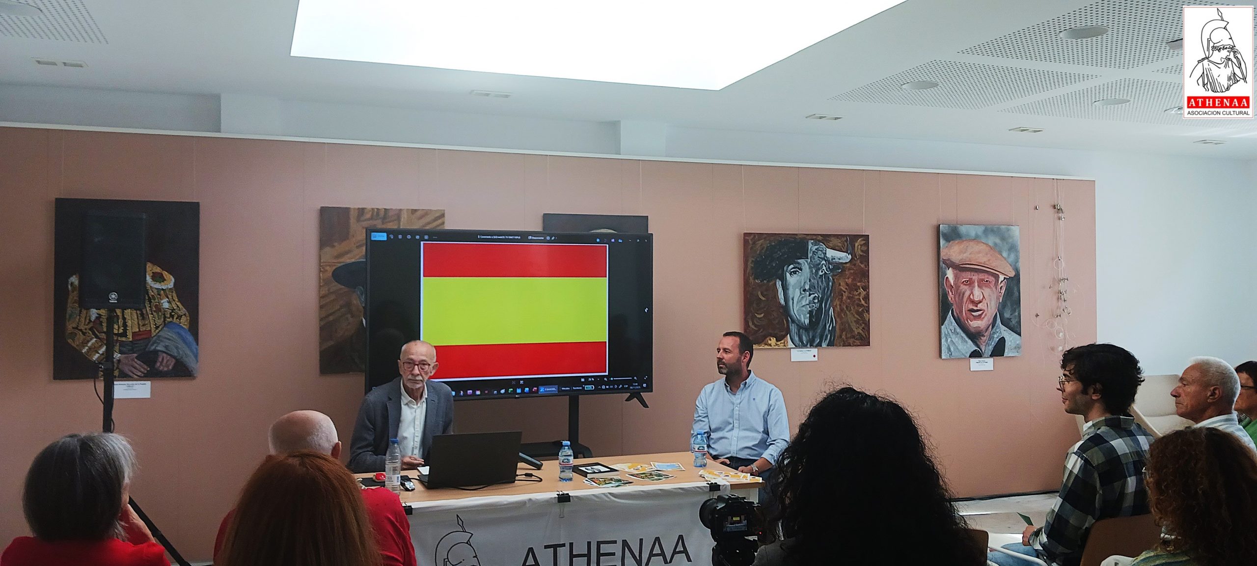 Elias inicia su charla coloquio con la proyección de una diapositiva de la bandera nacional como elemento identitario de los españoles, e ilustrativo para intentar definir que son los símbolos, sus curiosidades y convenciones históricas, una representación compleja a través de objetos y costumbres.
