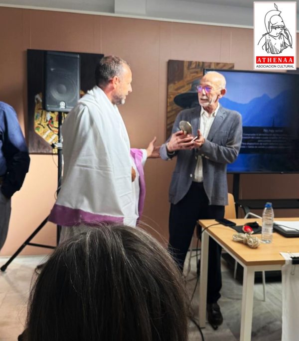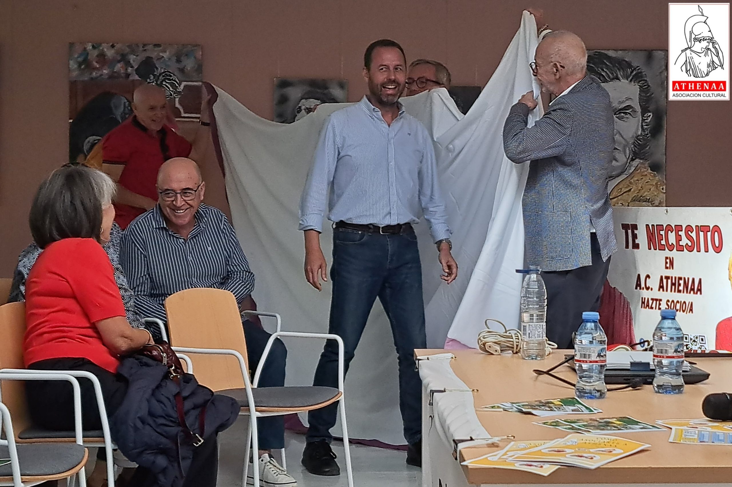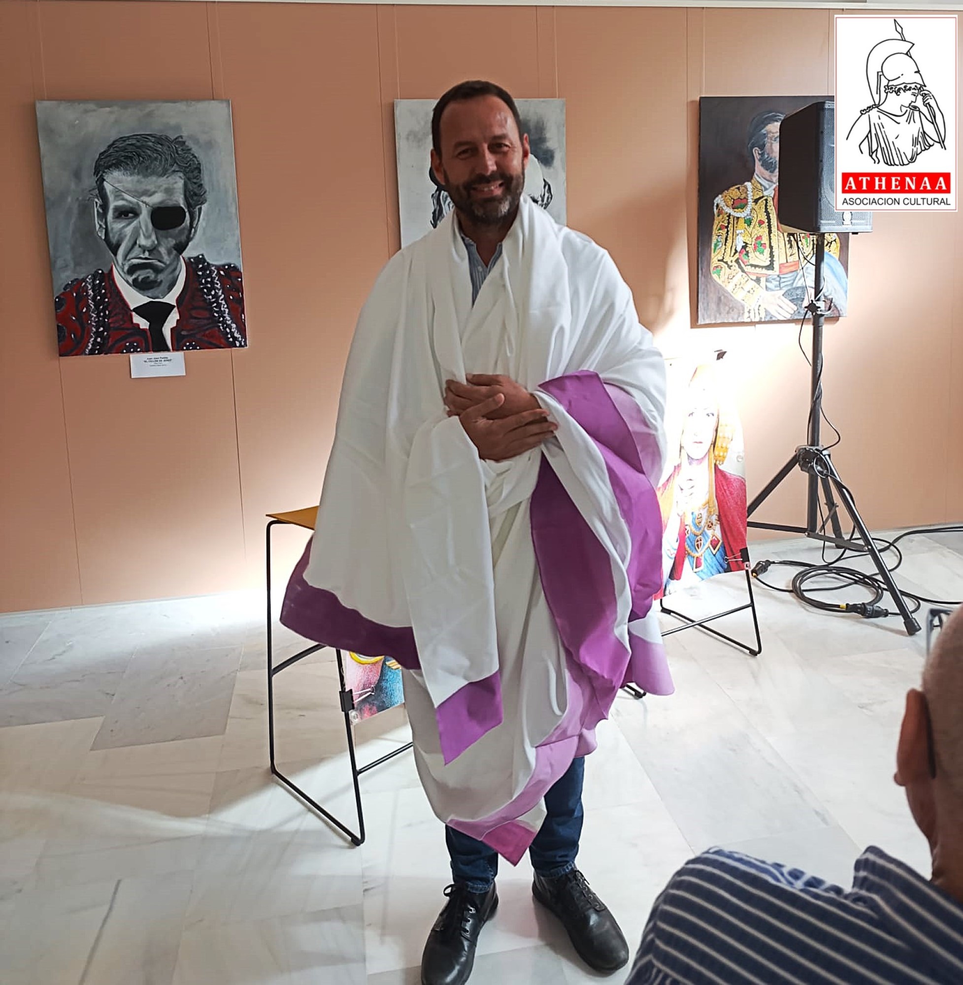 Como colofón a su exposición, Elias invita al presidente Samuel para presentar un símbolo muy importante en el mundo romano, se trata de la Toga, la prenda más importante del vestuario romano masculino que aportaba dignidad, clase, relevancia… para uso de los gobernantes y autoridades en eventos públicos, y ciudadanos en común en rituales sociales y religiosos. Dependiendo del cargo o el acto, existián distintos tipos de togas, unas con texturas especiales, o colores oscuros o púrpuras, otras con bandas o rayas…., incluso modos de colocarla según el evento, como el caso de cubrirse la cabeza en las ceremonias religiosas.