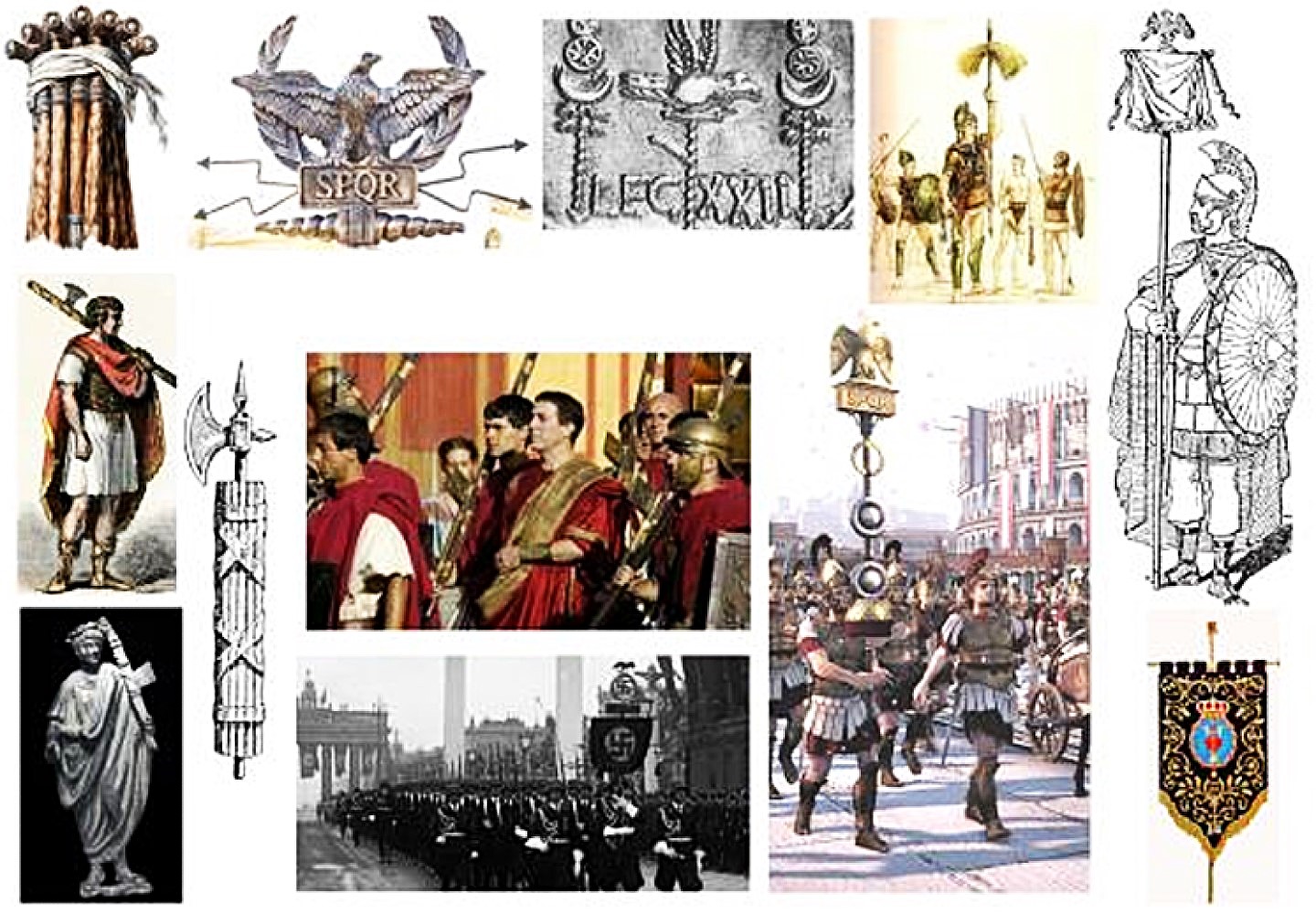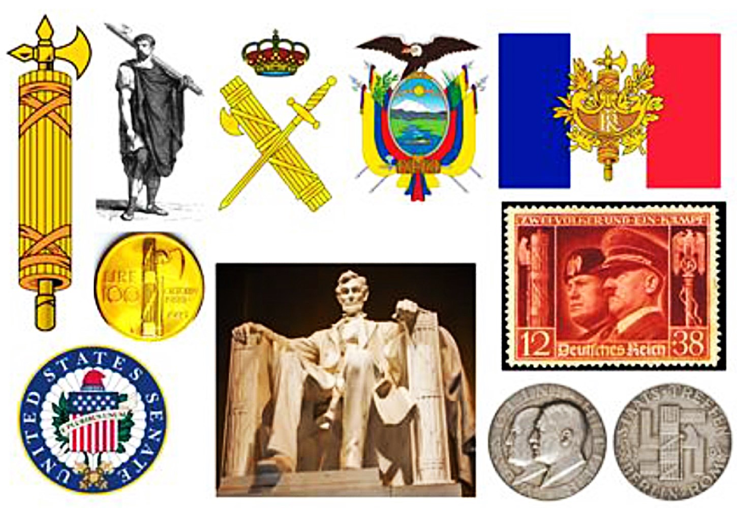Los símbolos evolucionan con el tiempo y Elias nos ponde varios ejemplos. En primer lugar los fasces, una unión de un conjunto de varas atadas con cinta de cuero rojo formando un cilindro que sujeta un hacha de doble filo, originalmente un emblema militar que simbolizaba “la unión hace la fuerza”, junto con el hacha que simboliza la justicia inpacable sobre la vida. Inicialmente era un emblema de poder militar de los reyes etruscos, fue adoptado por los monarcas romanos y adaptado de forma romántica por el fascismo. Se ha usado en la heráldica como símbolo de la justicia como en la democracia americana, y hoy forma parte del emblema de la Guardia Civil indicando su capacidad de vigilancia y de salvaguarda.