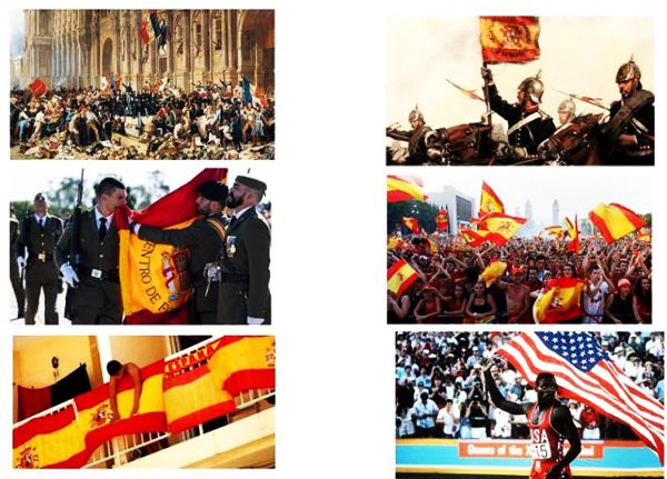 La bandera se convierte en el símbolo por excelencia de la nación de un pueblo, y en España su identificación y ritualización es un caso especial, formalizándose una serie de ritos, fundamentalmente militares. Su uso se reglamenta, preside los actos por encima de las personas, tiene su propio protocolo de movimiento, se le rinde honores con saludos y música, salvas de cañon, tiene himno y gritos de “Viva España”, tiene reconocimientos y signos de admiración y respeto. Se jura ante ella como símbolo de compromiso con la patria, se da la vida por ella, se ondea en balcones oficiales y civiles. Se crea una liturgia, literaratura y cancionero de carácter emotivo, como su uso en actos deportivos que a través de las Olimpiadas crea hábitos en su utilización.