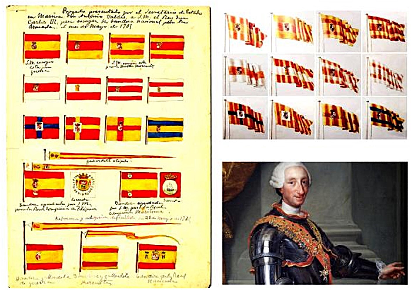 La bandera actual española nace en época de Carlos III por un motivo puramente funcional. Para evitar la confusión en la identifación de las naves de la marina española con el uso general de la bandera de fondo blanco, el rey encargó una insignia visible y distintivo del pabellón naval, y surgió la bandera roja y amarilla que contrasta sobre cielo y mar. En el tiempo de Carlos IV también pasó a las plazas marítimas y fortificaciones, y durante el reinado de Isabel II se amplió al ejército de tierra, procediéndose a unificar su uso como bandera española de todos los ejercitos, añadiéndose un valor sentimental y objeto de loas emotivas. Alfonso XIII apoyó al ejercito en la legitimidad de su defensa, siendo la justicia militar quien juzgue y penalice los agravios a los símbolos de la nación, bajo pena de prisión.