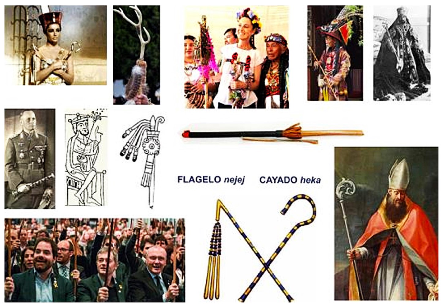 Uno de estos símbolos de poder en común con todas las civilizaciones y épocas, es el Bastón de Mando, un objeto que otorga autoridad y que remanece de las culturas más antiguas donde el pastor guía el rebaño con su cayado o palo de madera. El poseedor del palo que guía la comunidad legitima el poder del gobernarnte. De este concepto se deriva el Cetro, un símbolo de dominio o supremacía en un ámbito, como el usado por los faraones egipcios compuesto por el flajelo (látigo) y el cayado, o el cetro de Carlomango, también el cetro de Napoleón, o el recientemente utilizado en la coronación de Carlos III de Inglaterra.