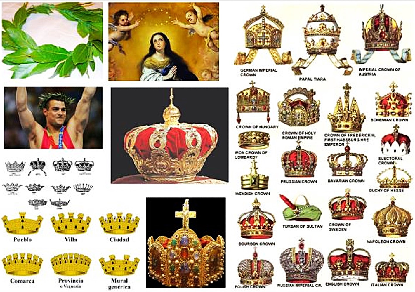 Otro de los objetos de símbolo de poder y autoridad es la Corona, el disco solar sobre la cabeza, la divinidad en la adoración al astro rey. A lo largo de la historia las variantes son incontables, desde la corona de laurel en la antigua Grecia y Roma, hasta la corona de oro de Inglaterra. No solo es un atributo para reyes o emperadores, también es usado por la nobleza, por la jerarquía de la iglesias como obispos, papas…, también en los escudos de reinos y ciudades, incluso hasta en escudos deportivos. Se diversificó tanto su uso que hubo que reglamentarlo para establecer un orden.