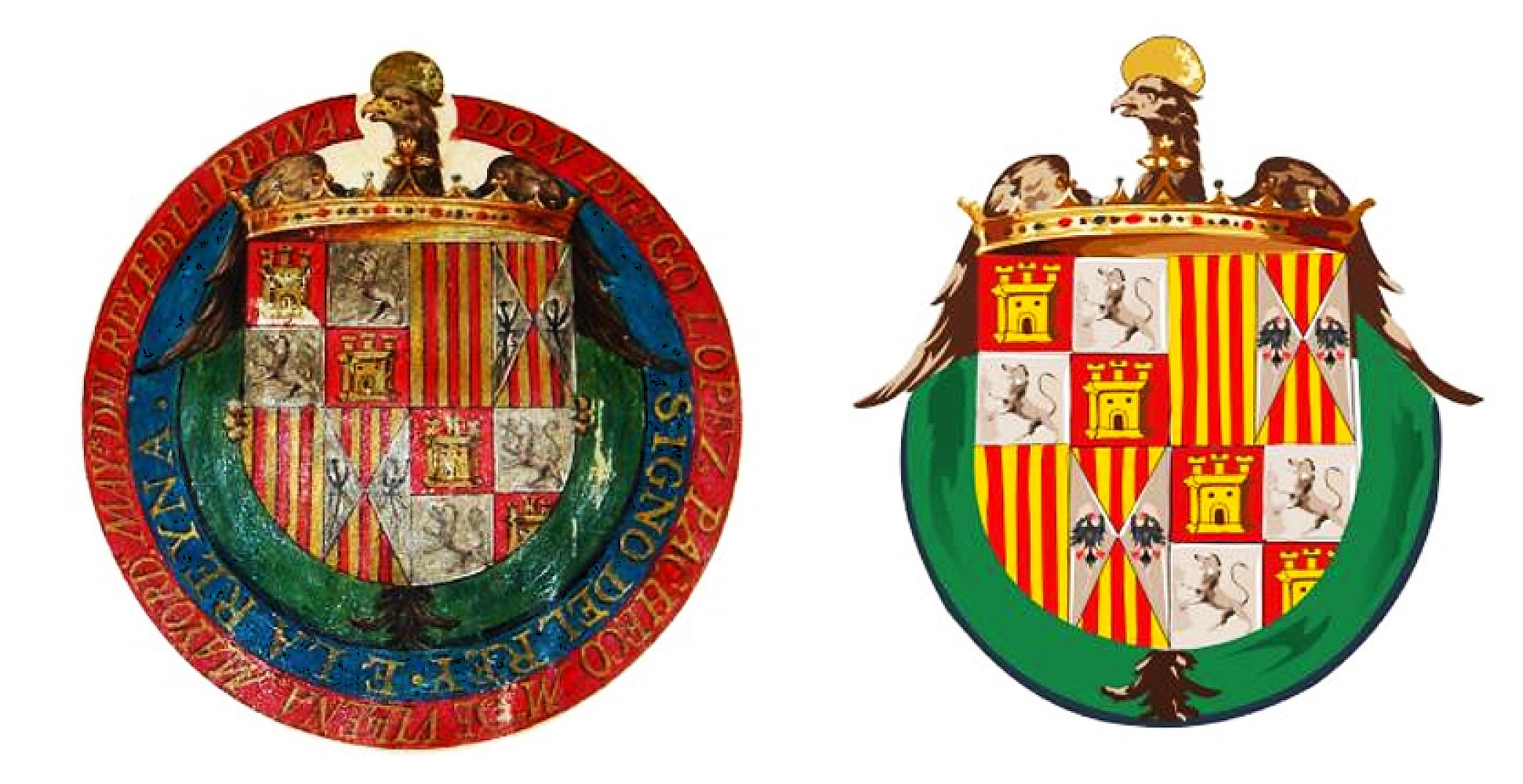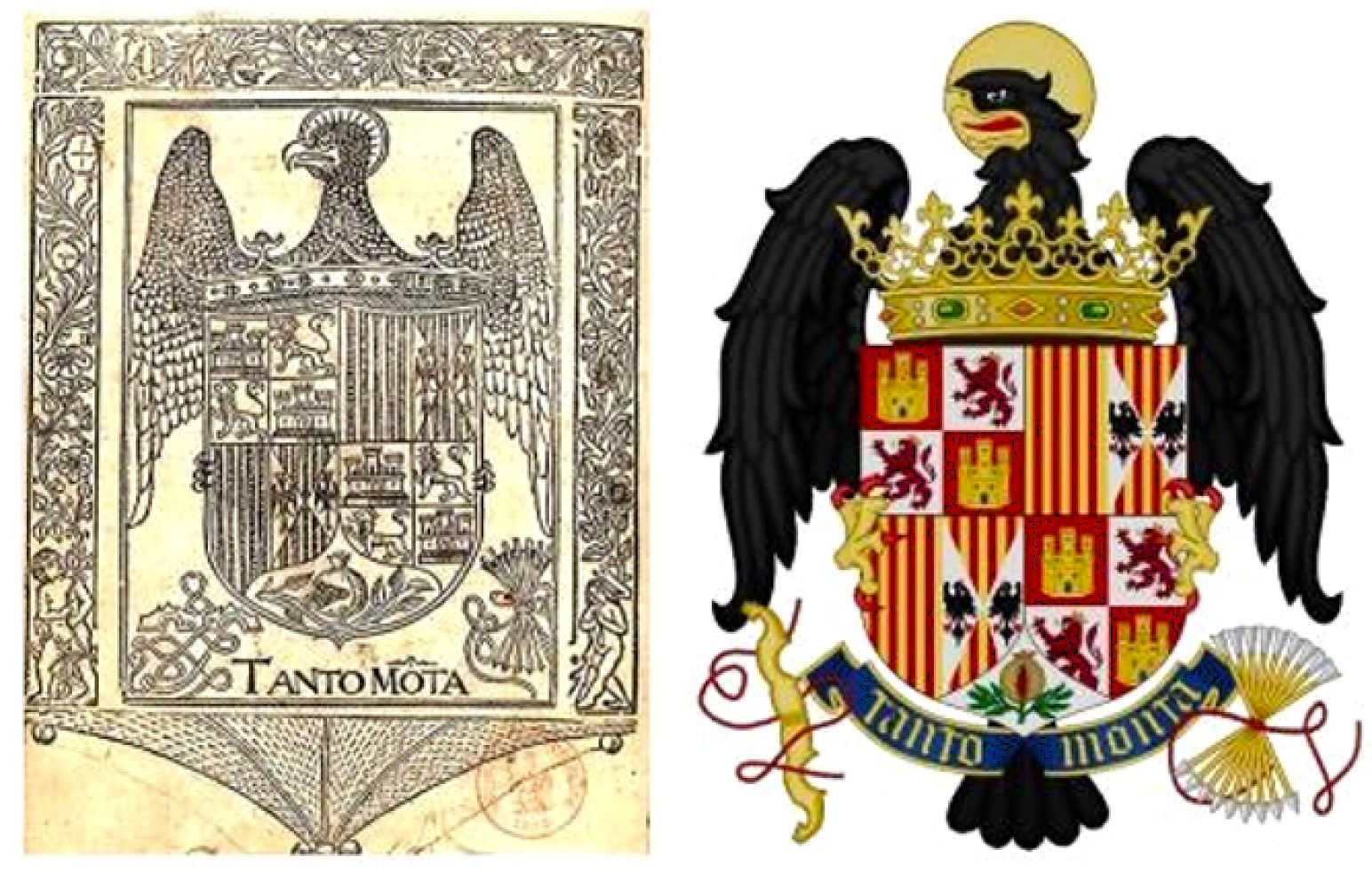 Las convenciones evocan lenguajes que forman parte del imaginario estético y literario de la historia desde la Edad Media, como los blasones, divisas, sellos, atributos, jeroglíficos, gritos de guerra, victorias… Elias nos comenta lo interensantes que son los escudos y en especial el complejo escudo de armas de los Reyes Católicos construido con los símbolos de los reinos, del águila, el yugo con el “nudo gordiano”, el “Tanto Monta”, el haz de flechas, y la evolución del mismo en los siguientes reinados, con la salida de elementos caducos e incorporación de nuevos como las columnas de Hércules y el “Plus Ultra”, el águila bicéfala, el toisón de oro.., pero por la limitación del tiempo no va a entrar a desarrollar.