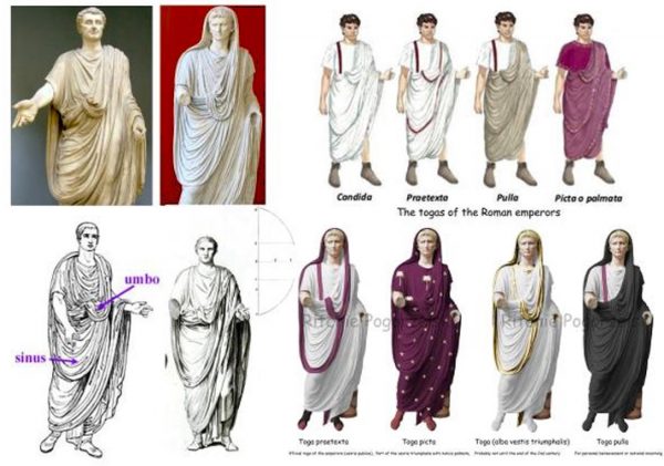 Para mostrar como se colocaba una Toga, algo no sencillo y que se necesitaba ayuda, Elias procede a colocarle a Samuel la toga que acaba de regalarle, un modelo de tela blanca con forma de semicirculo de 6 metros de diámetro en una sola pieza. La parte superior cae en forma de curva por la cadera derecha y después cruza el pecho en diagonal, formando el SINUS. La parte que iba desde el hombro izquierdo hasta el suelo, se estiraba hacia arriba por el sinus para caer formando un pequeño embolsamiento hacia adelante llamado UMBO. Solían estar tejidas de una sola pieza pero quizás las más grandes estaban compuestas de dos piezas cosidas. No se usan imperdibles ni agujas para mantener la toga, pero la parte que caía del hombro hasta el suelo se mantenía por su propio peso.