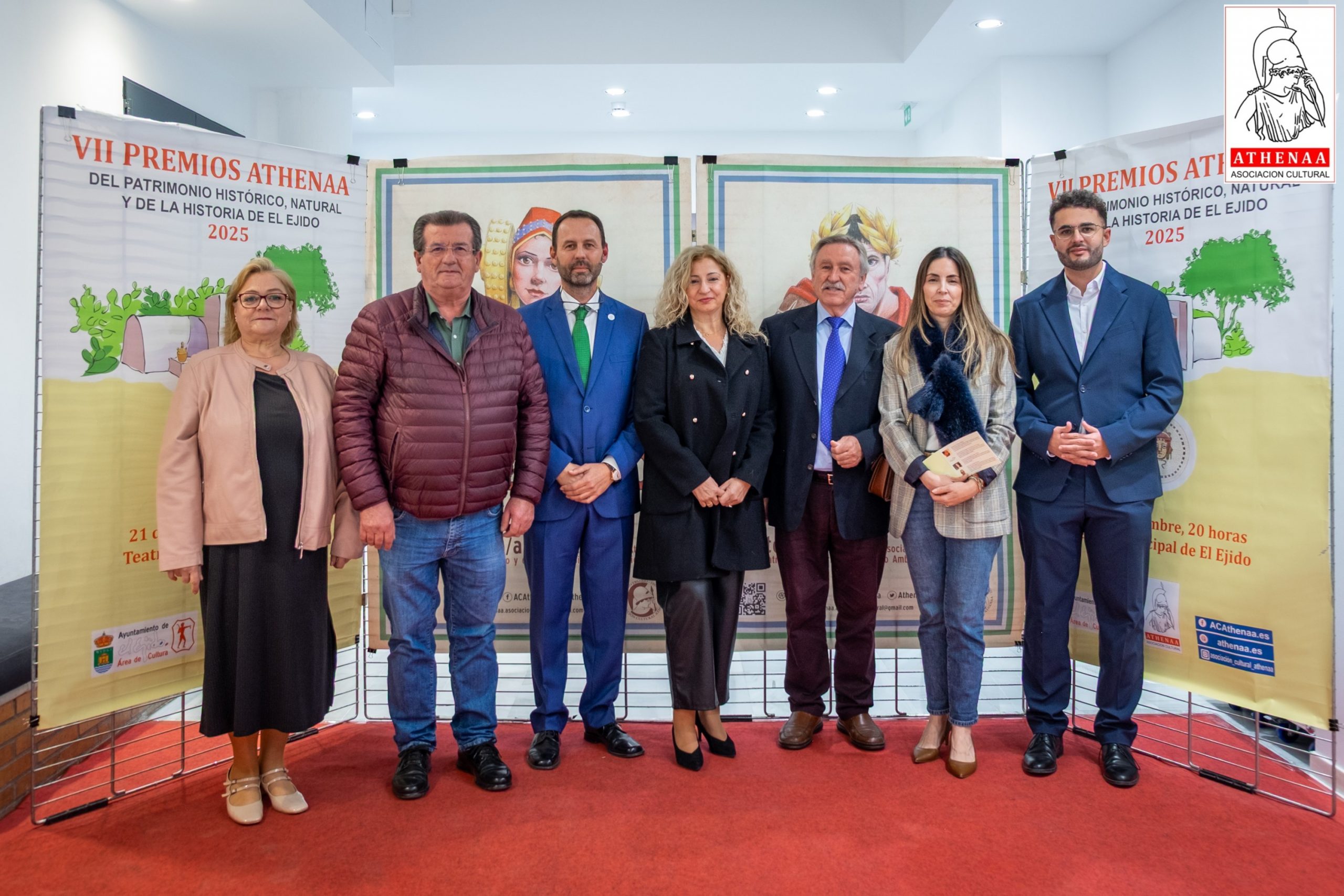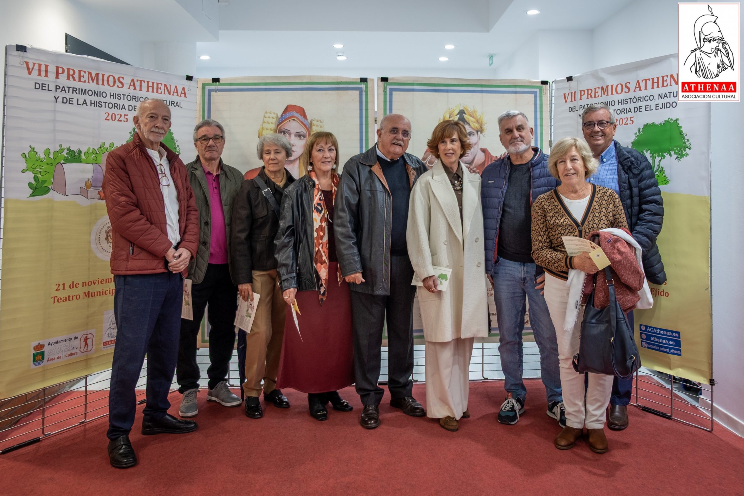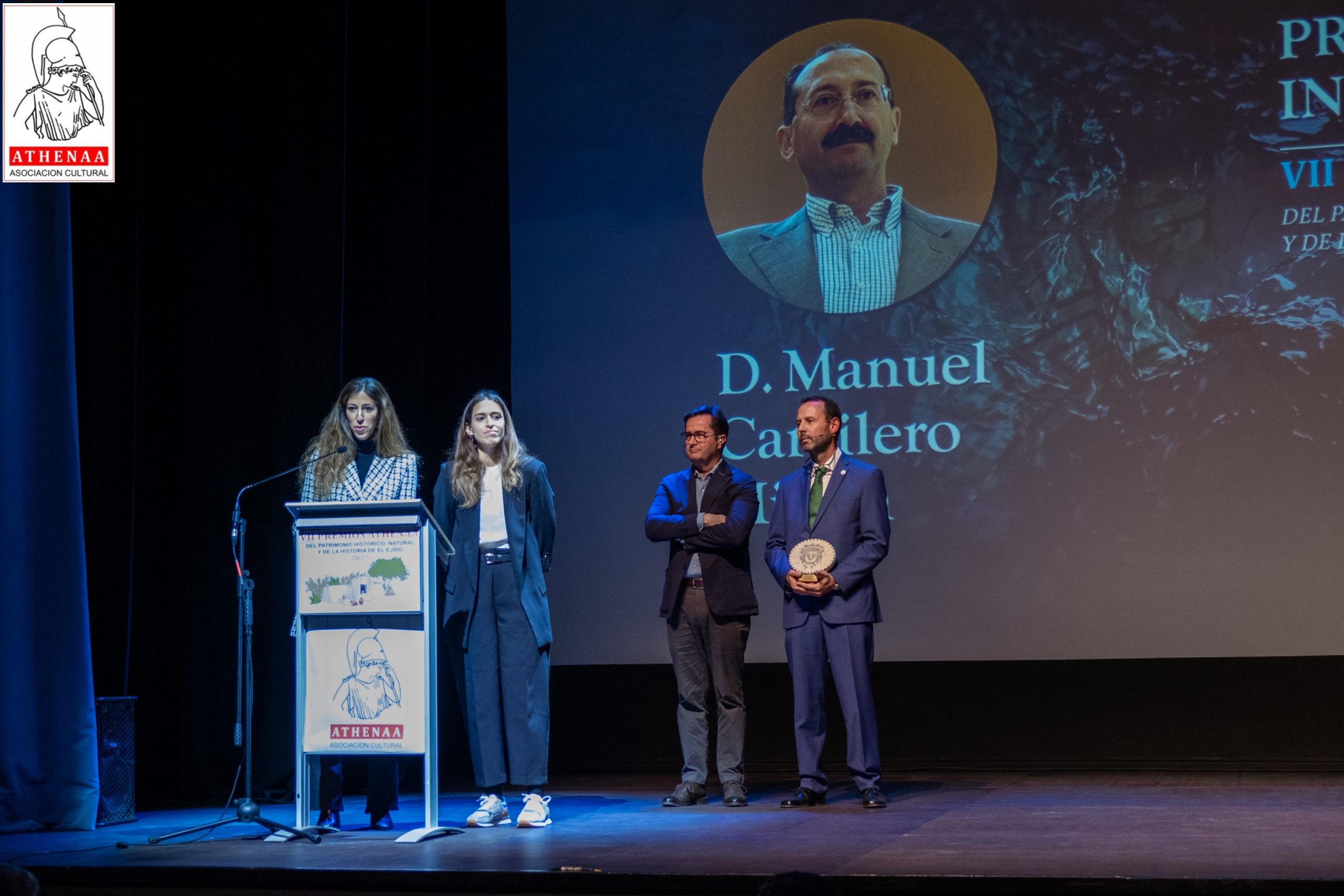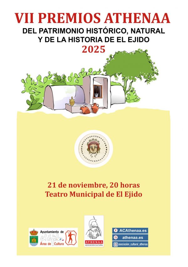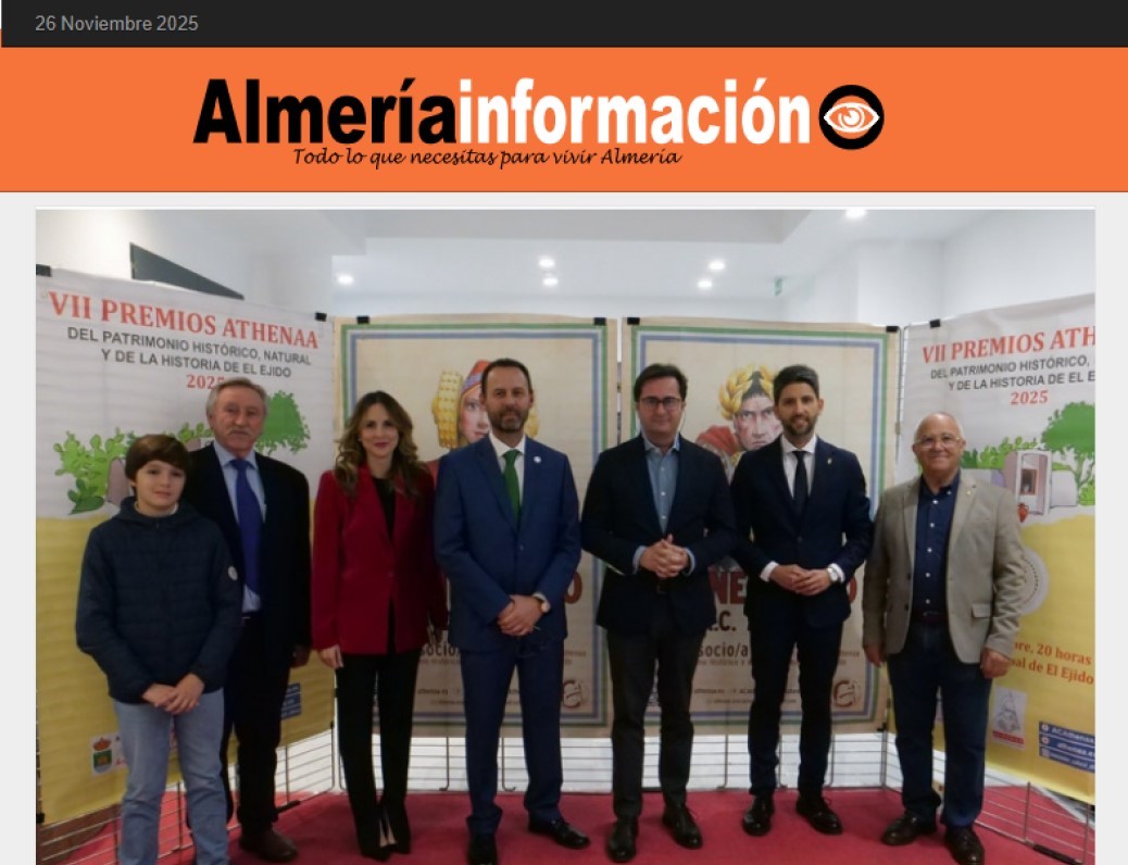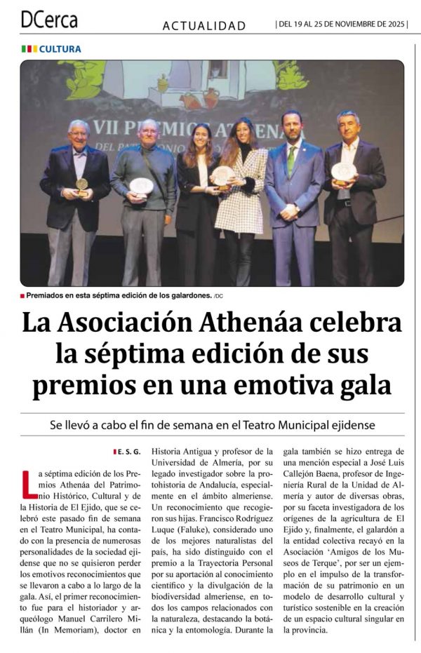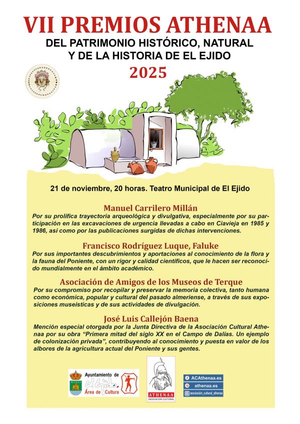 El Teatro Municipal de El Ejido ha acogido el pasado viernes día 21/noviembre la celebración de la VII GALA de entrega de los PREMIOS ATHENÁA sobre el Patrimonio Histórico, Natural y de Historia de El Ejido, correspondientes al año 2025, organizada por la Asociación Cultural «ATHENÁA«, que ha contado con la colaboración del Ayuntamiento de El Ejido.