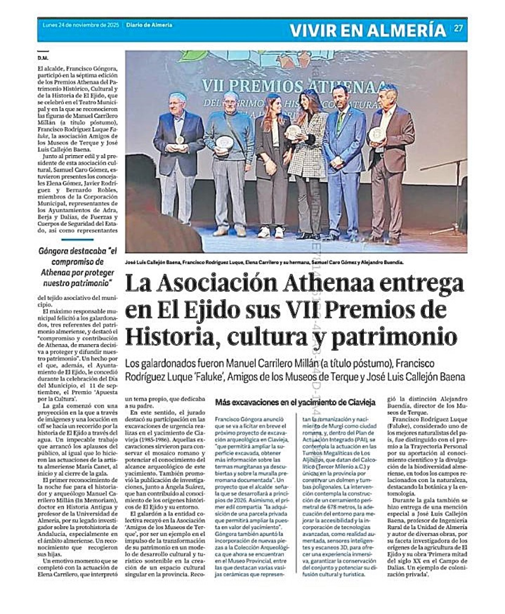 Como ven, los reconocimientos deben hacerse en vida. Y ese hubiera debido ser el caso de Manuel Carrilero Millán. Para Athenáa la contribución de Manuel, junto a la de Ángela Suárez, fue fundamental para el conocimiento de un lugar llamado Ciavieja y su amplia secuencia estratigráfica, al menos desde el Neolítico Reciente. Quien lo iba a decir para un «pueblo sin historia» y cuyas gentes, como hemos visto, estaban ávidas por tener historia y no ser menos que sus pueblos vecinos. Una desgracia arqueológica como fue el socavón de Ciavieja abrió la ventana a la historia de El Ejido y de Almería. Y sin duda Manuel y Ángela estuvieron a la altura de lo que un yacimiento de esa envergadura exige. Así nació la preocupación de unos locos jóvenes por su historia y su patrimonio que poco tiempo después acabaron fundando Athenáa.