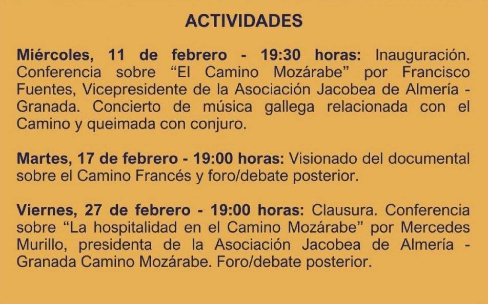 Además del concierto de música gallega relacionada con el camino, el acto incluyó una conferencia de Francisco Fuentes sobre el Camino Mozárabe de Santiago entre Almería, Guadix, Granada, Córdoba y Mérida, el camino de los sentidos.