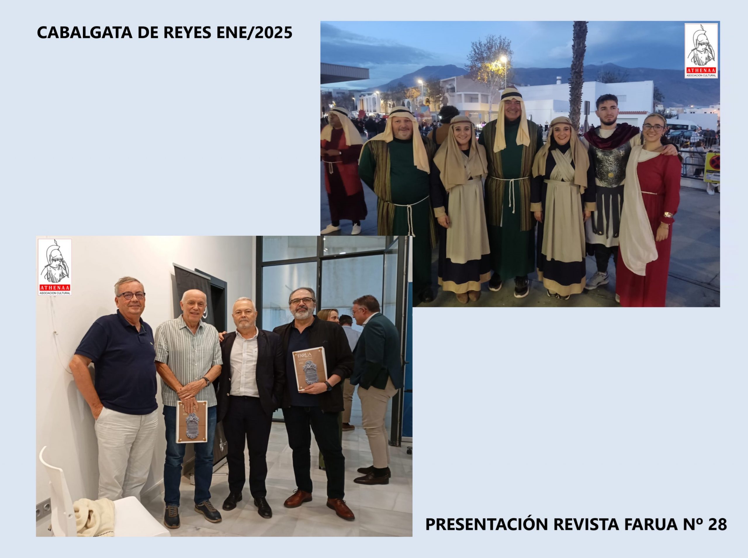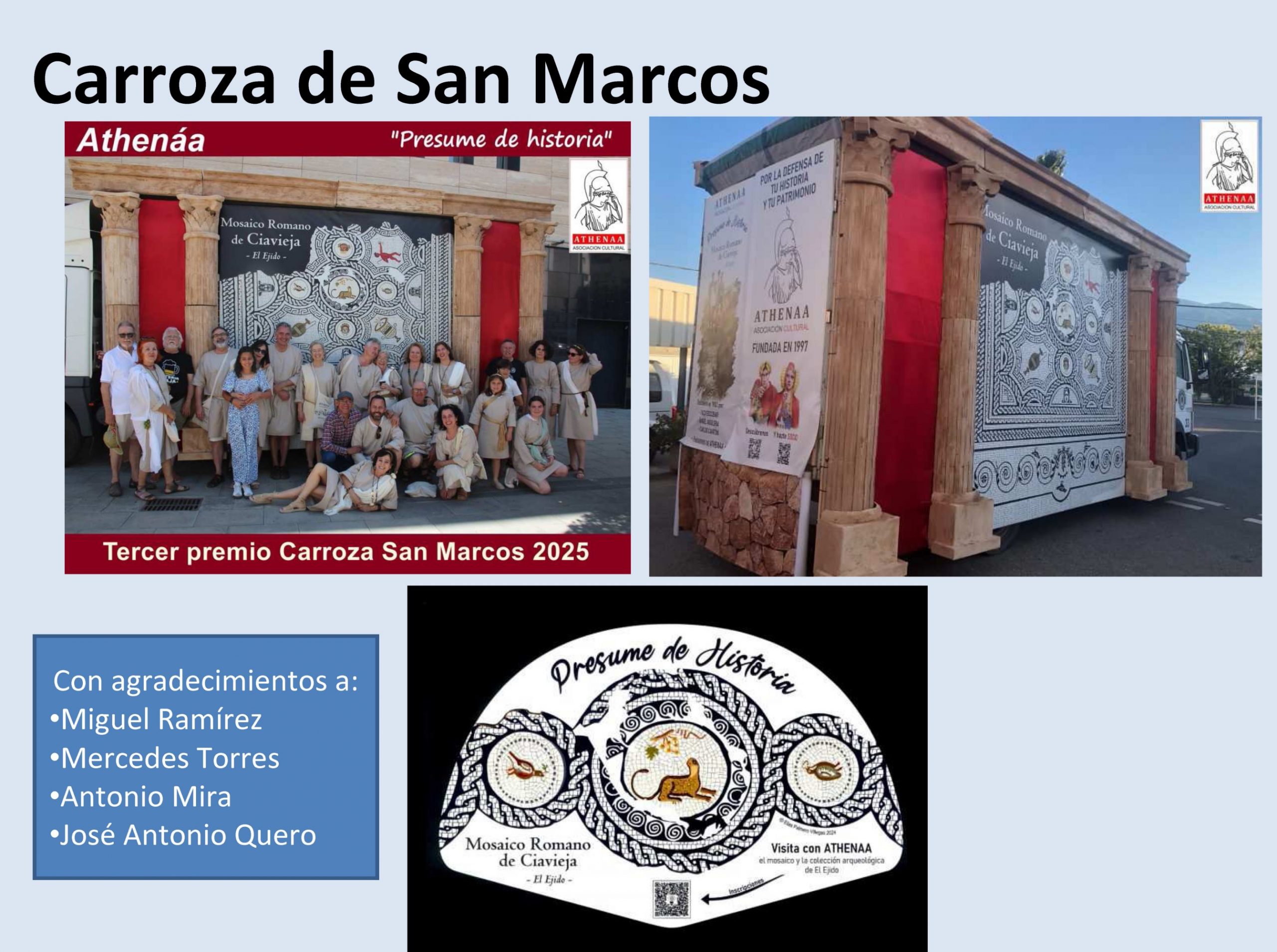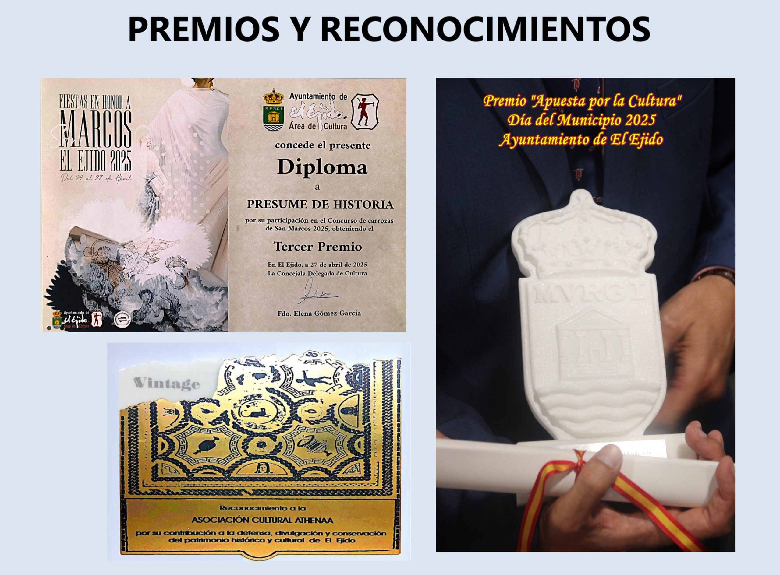 -Y los Premios y reconocimientos obtenidos por Athenáa durante el 2025: el Tercer Premio en las Carrozas de San Marcos; reconocimiento de la Revista Vintage por la contribución a la defensa, divulgación y conservación del patrimonio histórico y cultural de El Ejido; y el Premio «Apuesta por la Cultura» en el Día del Municipio 2025 por el Ayuntamiento de El Ejido .