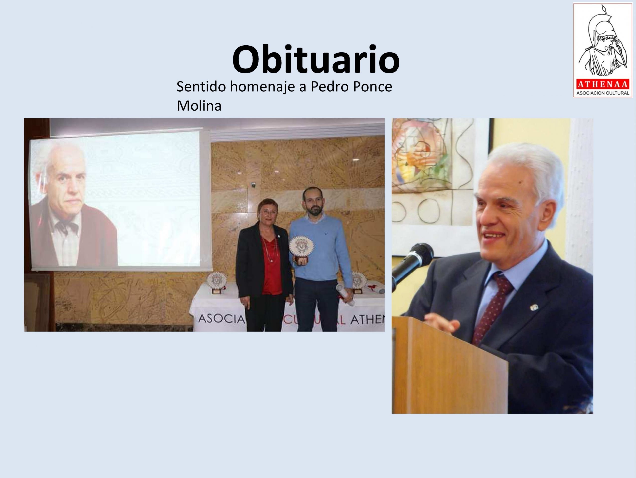 Una vez leída y aprobada el acta de la Asamblea anterior, el Presidente antes de iniciar con el informe de actividades hace un emotivo recordatorio por la dolorosa perdida en este curso de dos figuras relacionadas con el patrimonio histórico; nuestro profesor y premiado de Athenáa, Pedro Ponce, un pilar fundamental en el estudio e investigación de nuestra historia; y Antonio Campos, un historiador solvente y reconocido, y sobre todo un amigo que ofreció su colaboración incondicional con nuestra asociación.