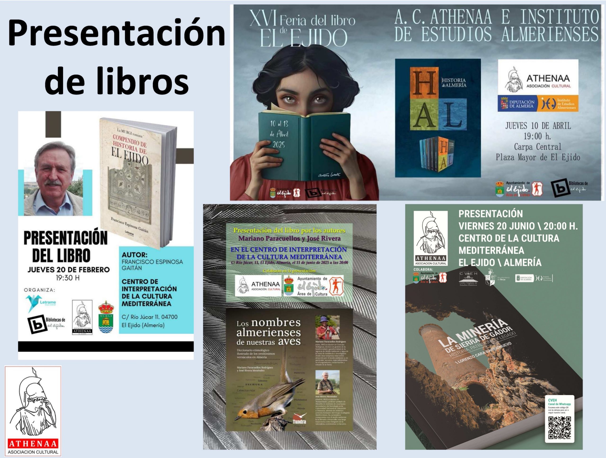 A lo largo del año, Athenáa también ha colaborado en el fomento y presentación de libros relacionados con la historia y el patrimonio cultural y natural de El Ejido, como la reedición del «Compendio de historia de El Ejido» de nuestro amigo y expresidente de Athenáa, Francisco Espinosa; la colección de 5 tomos sobre «La Historia de Almería» editado por el Instituto de Estudios Almerienses (IEA) de la Diputación de Almería; «Los nombre almerienses de nuestras aves» por sus autores Mariano Paracuellos y José Rivera Menéndez; y «La Minería de Sierra de Gádor. Historia, patrimonio y legado», el último libro de Lorenzo Cara sobre la fascinante historia minera de Sierra de Gádor.