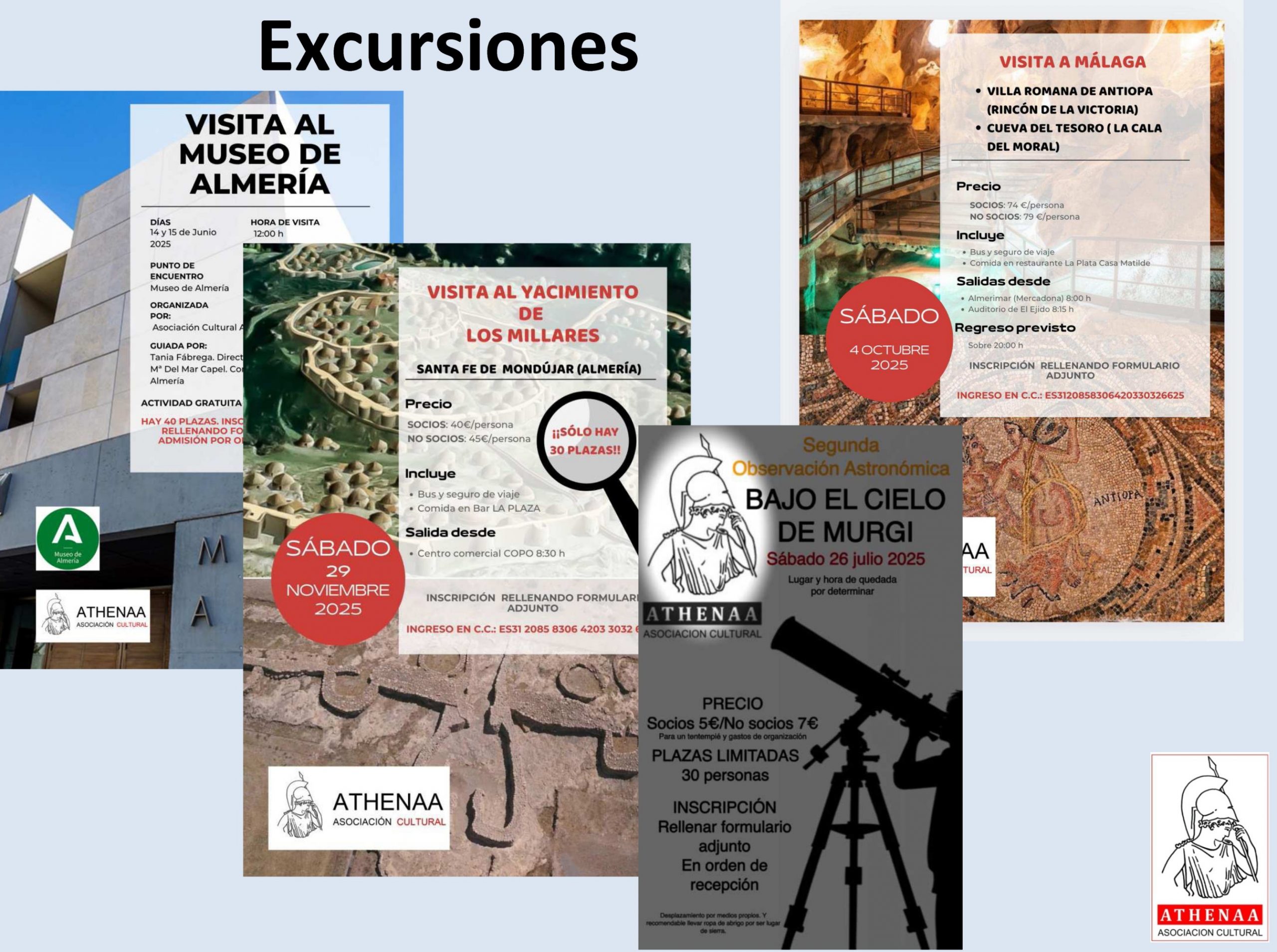 También se hizo un repaso tanto de las excursiones y viajes realizados a los diferentes destinos de interés patrimonial histórico, como la visita por invitación al Museo de Almería donde tuvimos la oportunidad de poder conocer los entresijos y fondos del museo, en especial los materiales extraídos en las últimas excavaciones de Ciavieja; a la localidad malagueña del Rincón de la Victoria para visitar el yacimiento romano de Antiopa, la mejor villa marítima conservada de Andalucía, así como la Cueva del Tesoro de origen marino, la única de este tipo en Europa que es visitable; a plena Sierra de Gádor a 1.000 m. de altitud, donde pudimos disfrutar de la segunda observación astronómica de nuestro patrimonio visual (y natural), organizada conjuntamente con la Asociación Astronómica Orión de Almería; y la segunda visita al yacimiento de los Millares en Sata Fé de Mondujar, un enclave arqueológico referente del Calcolítico a nivel europeo.