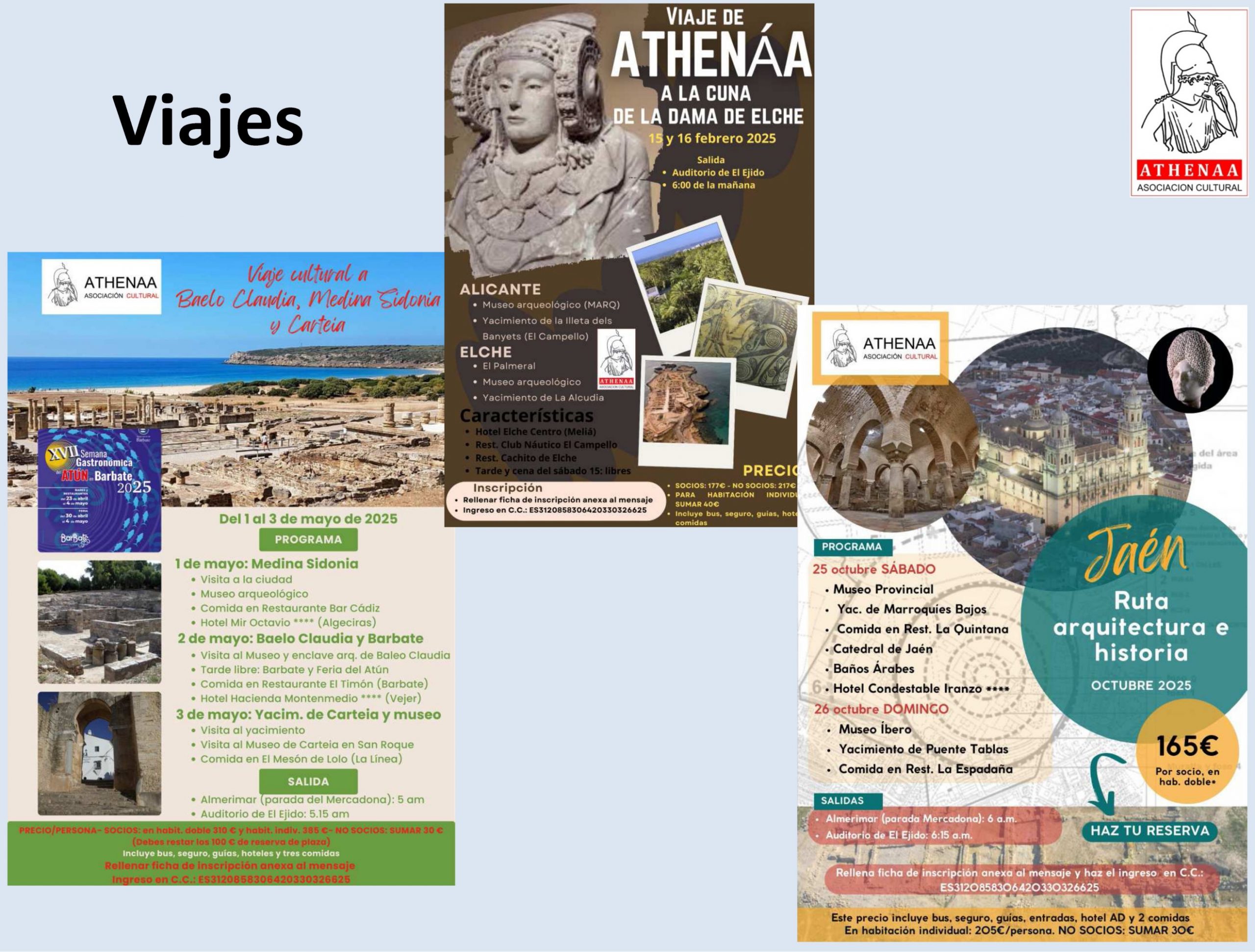 Con respecto a los viajes: el interesante desplazamiento al levante español cuna de la Dama de Elche para visitar el Museo Arqueológico de Alicante (MARQ), la Illeta dels Banyets en El Campello, el Yacimiento de Ilici-L’Alcúdia y el Huerto del Cura en Elche; a los lugares históricos de la provincia de Cádiz, visitando la ciudad de Medina Sidonia, el enclave arqueológico de Baelo Claudia en la playa de Bolonia y el yacimiento y museo de Carteia en San Roque; y a la ciudad de Jaén para conocer su legado histórico y el patrimonio monumental, visitando el Museo Provincial de Jaén con sus secciones de Arqueología y Bellas Artes, la Zona Arqueológica de Marroquíes Bajos, la Catedral de Jaén, los Baños Árabes, el novedoso y único Museo Íbero, y el yacimiento de Puente Tablas.