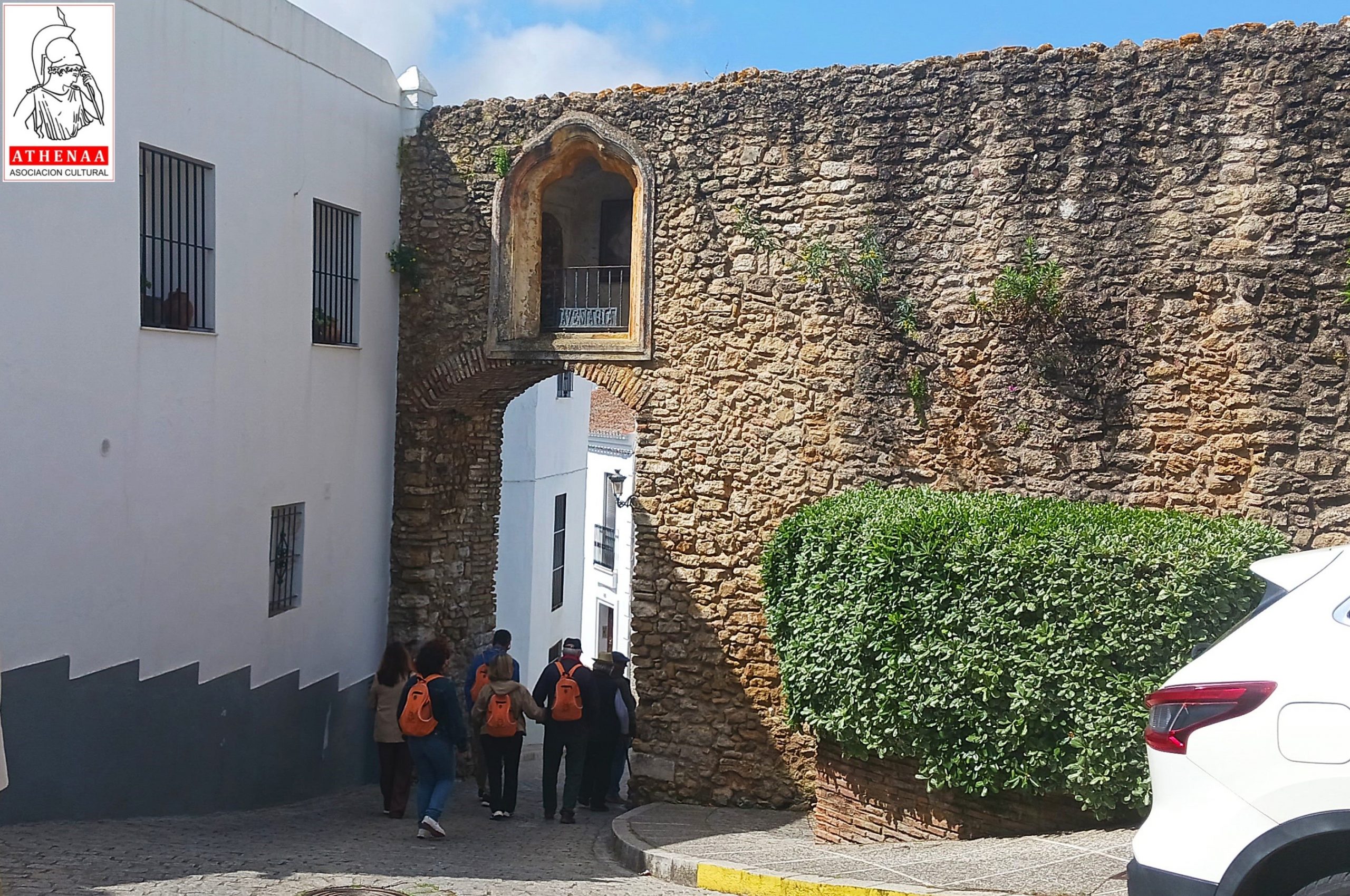 Iniciamos nuestra visita en la zona oriental en extramuros, en la Avd. de la Sierra junto a la puerta este de acceso a la ciudad desde las huertas, llamada Puerta del Sol por ser donde despunta el sol cada mañana. Es una de las entradas del recinto amurallado urbano de la MADINAT SADUNA islámica, junto con la Villa Vieja y el Castillo en la zona más elevada de la ciudad, formando un complejo defensivo casi inexpugnable. Es la primera zona habitada después de la conquista de Alfonso X y en la actualidad coincide con el Barrio de Santa María. En este enclave nos espera Fran que va ser nuestro guía por la ciudad, y después de una pequeña introducción sobre el lugar cruzamos la puerta, de inmediato nos encontramos con el espacio donde hasta los años treinta del siglo pasado se encontraba el palacio de los duques de Medina Sidonia, así como la también desaparecida casa natal del que fue Ministro de Marina en 1893 y senador vitalicio del Reino, el almirante Pascual Cervera y Topete.