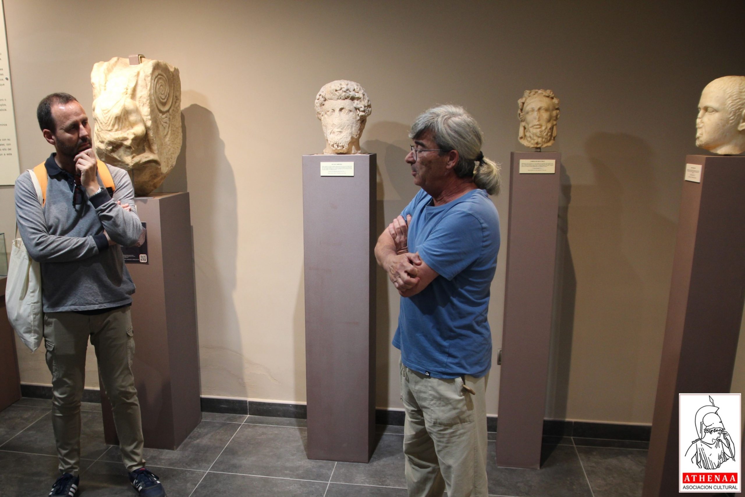 Samuel Caro y Salvador Montañes delante del conjunto estatuario: ménsula de Victoria alada, retrato antoniano (s.II d.C), busto sátiro del dios Baco y busto hombre época Claudia.