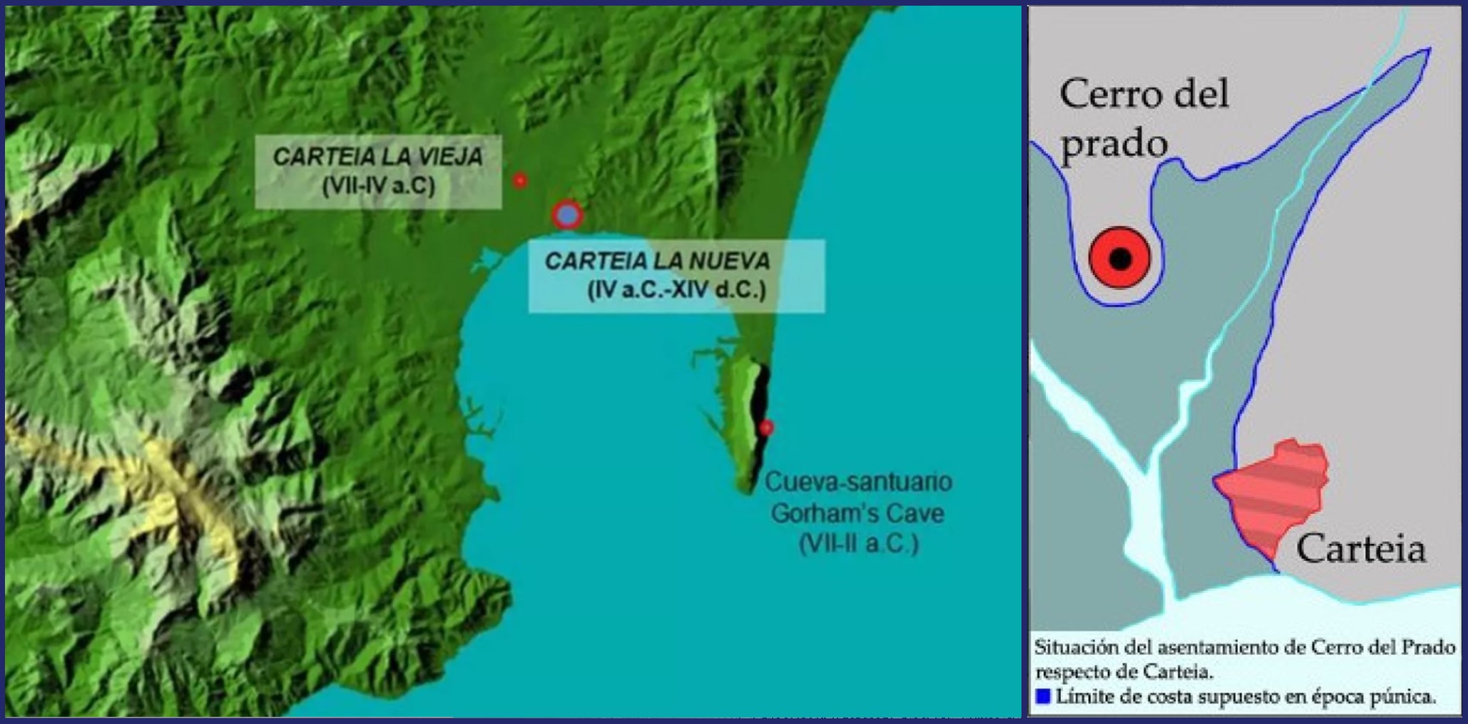 La ciudad de Carteia está situada junto a la desembocadura del rio Guadarranque. Tiene un origen fenicio, fundada en el siglo VII a.C. sobre un asentamiento inicial en el Cerro del Prado (Carteia la Vieja) a unos 2 km. al noroeste de Carteia y que en su época era zona costera, pero con la progresiva colmatación del curso del rio y el alejamiento de la línea de costa, en el siglo IV a.C., la población (cartaginense o púnicos) en base a los intereses estratégicos se reubicó donde hoy la conocemos (Carteia la Nueva), en una colina al margen izquierdo del rio y frente a la bahía de Algeciras, un lugar privilegiado como abrigo marítimo y con ricos recursos pesqueros para explotar, y sobre todo para el control del Estrecho de Gibraltar, convirtiéndose en poco tiempo en un destacado puerto de comercio y un importante centro económico, religioso y político.