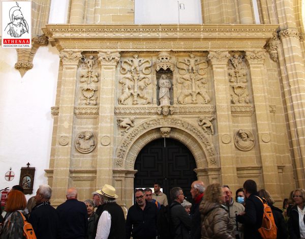 Para hacer nuestra visita al templo, Fran nos propone hacerlo por el claustro donde en su interior está la tercera puerta que da a la iglesia, y por tanto nos dirigimos desde la plaza a través de una escaleras y basamento que nos lleva a una puerta junto a la torre por donde se accede al claustro.