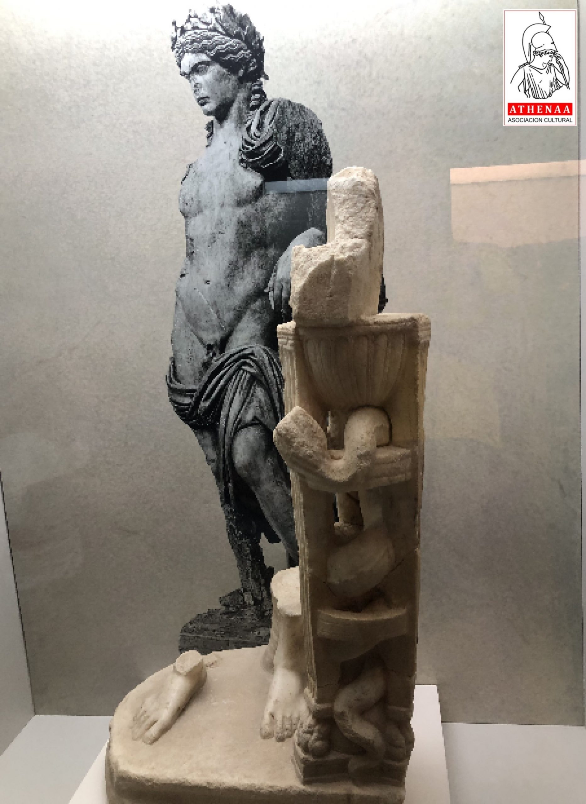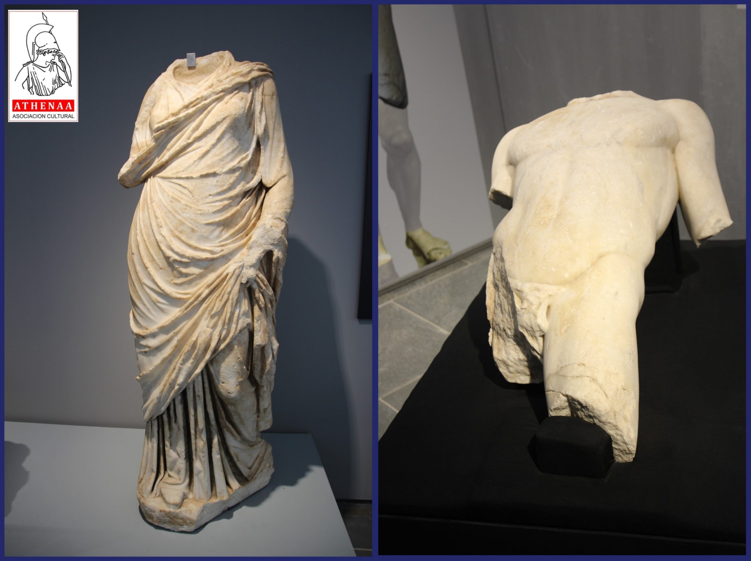 Samuel Caro y Salvador Montañes delante del conjunto estatuario: ménsula de Victoria alada, retrato antoniano (s.II d.C), busto sátiro del dios Baco y busto hombre época Claudia.
