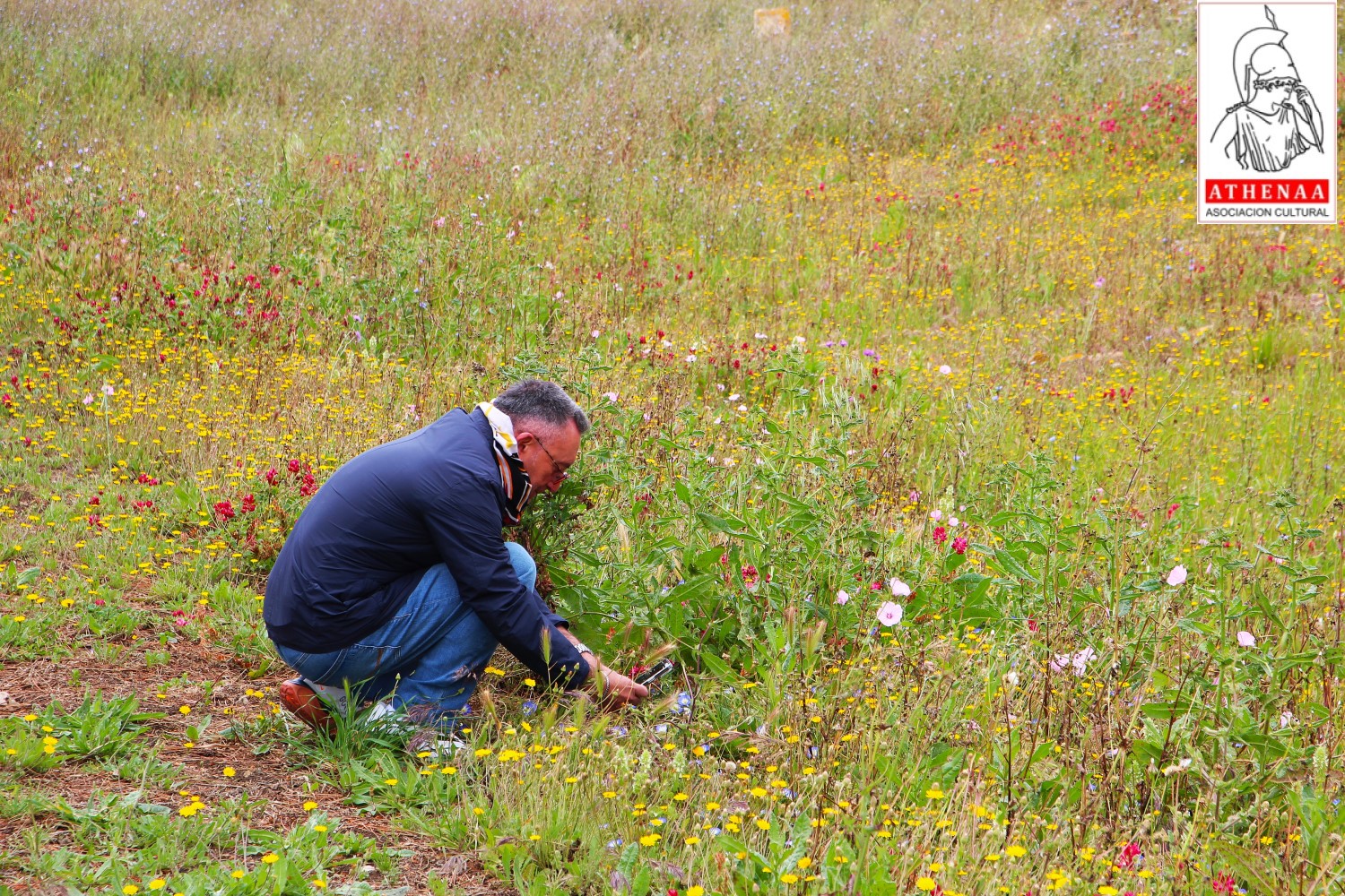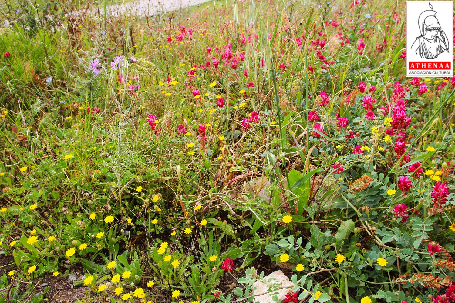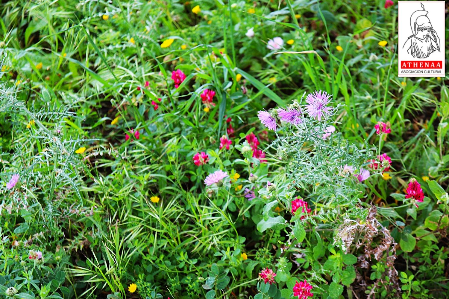Siguiendo el itinerario oficial del recorrido tomamos el camino habilitado entre el muro oriental y el arroyo de Chorrera que nos lleva al este de la zona central del yacimiento, y lo hacemos contemplando la configuración arquitectónica de la muralla oriental y sus torres, a la vez que disfrutamos de las vistas y el bonito estado floral del campo que nos ha regalado las últimas lluvias.