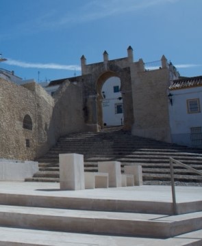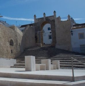 Iniciamos nuestra visita en la zona oriental en extramuros, en la Avd. de la Sierra junto a la puerta este de acceso a la ciudad desde las huertas, llamada Puerta del Sol por ser donde despunta el sol cada mañana. Es una de las entradas del recinto amurallado urbano de la MADINAT SADUNA islámica, junto con la Villa Vieja y el Castillo en la zona más elevada de la ciudad, formando un complejo defensivo casi inexpugnable. Es la primera zona habitada después de la conquista de Alfonso X y en la actualidad coincide con el Barrio de Santa María. En este enclave nos espera Fran que va ser nuestro guía por la ciudad, y después de una pequeña introducción sobre el lugar cruzamos la puerta, de inmediato nos encontramos con el espacio donde hasta los años treinta del siglo pasado se encontraba el palacio de los duques de Medina Sidonia, así como la también desaparecida casa natal del que fue Ministro de Marina en 1893 y senador vitalicio del Reino, el almirante Pascual Cervera y Topete.
