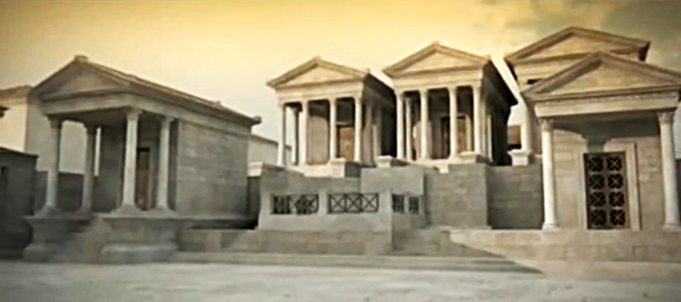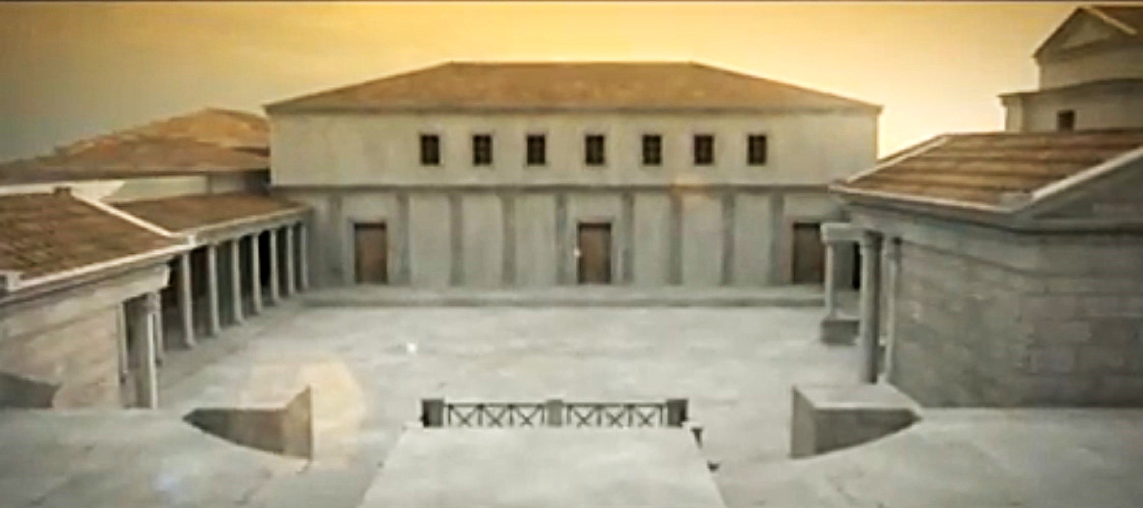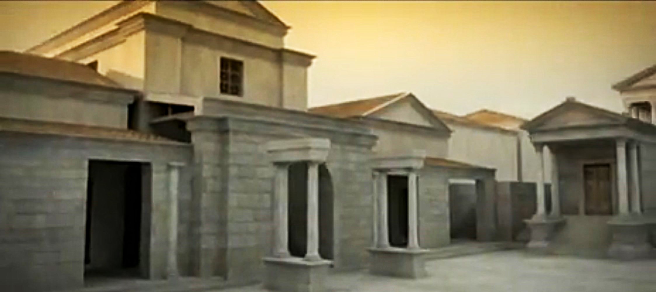 Recreación idealizada oeste Plaza del Foro con la Curia y escuela. (italicaromana.blogspot.com)