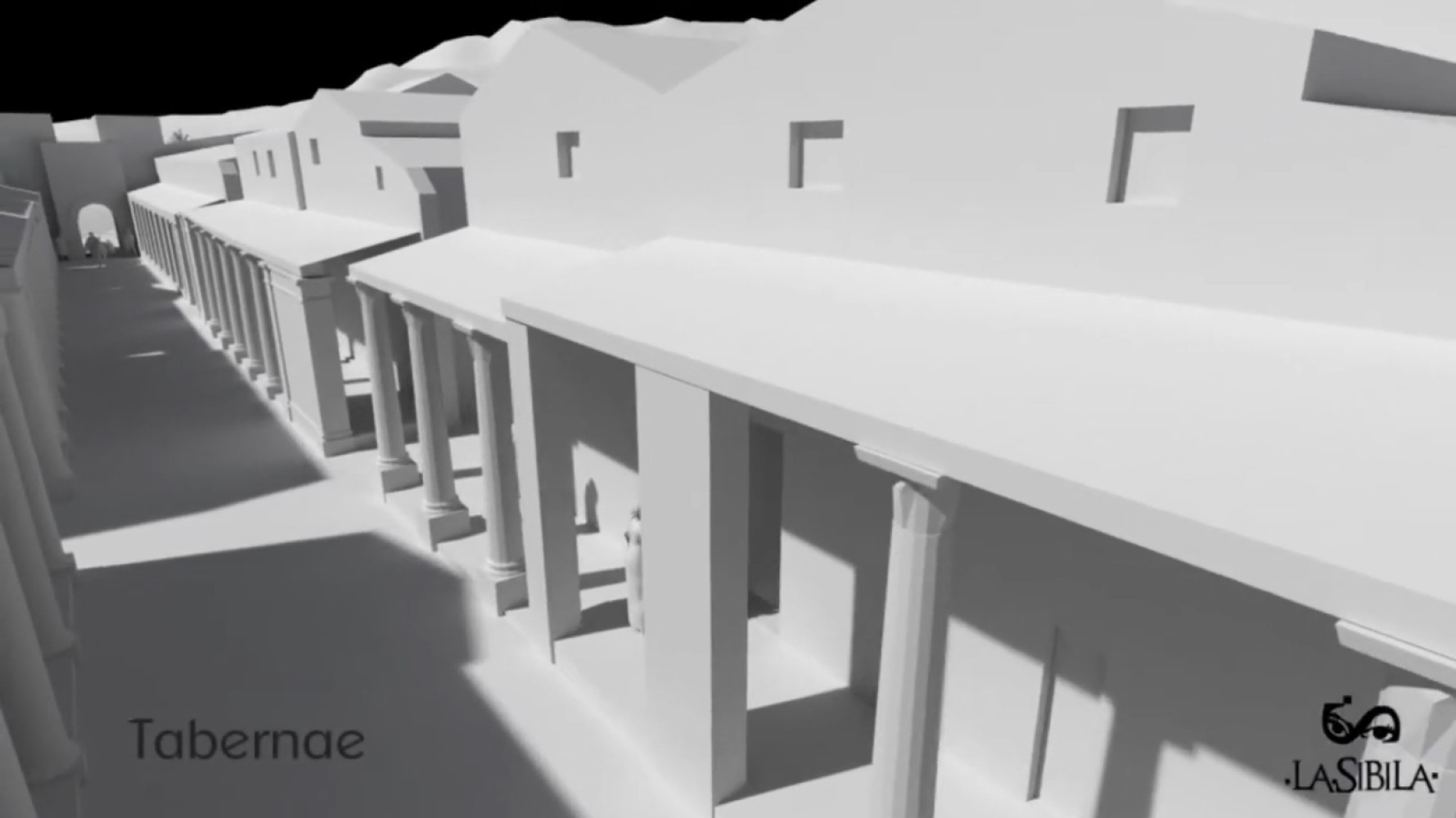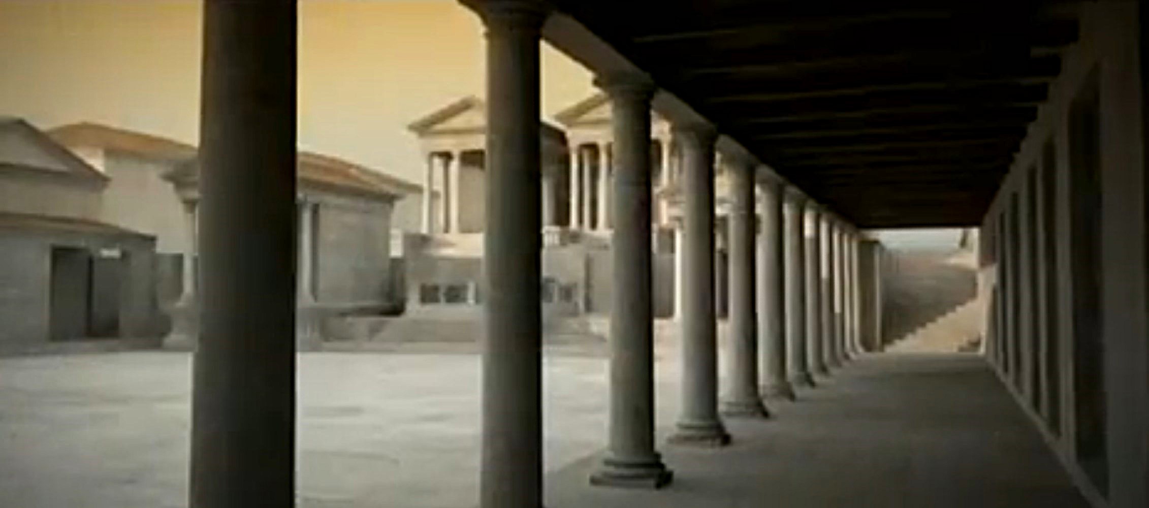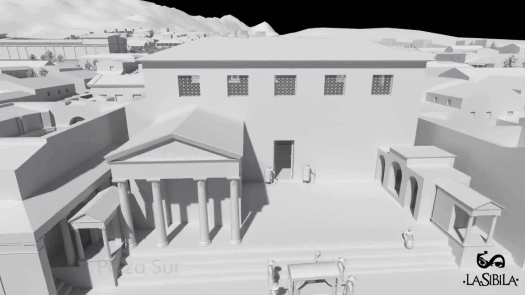 Recreación idealizada oeste Plaza del Foro con la Curia y escuela. (italicaromana.blogspot.com)