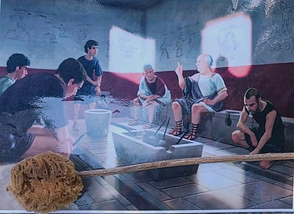 Salimos del centro monumental para volver por el sendero hacia la zona sur del yacimiento donde se encuentra una construcción de gran envergadura del siglo I d.C., se trata de las Termas. Contaba con todas las dependencias típicas, zona caliente, templada y fría, zona de vestuario, y además con una palestra para la gimnasia, piscina al aire libre y una letrina. Sobre esta última estancia, la guía nos habla sobre el uso de un utensilio para la higiene personal después de usar el baño, consistía en una esponja marina fijada a un extremo de un palo de madera (xylospongium o tersorium). Estuvo en uso como zona de baño hasta el siglo IV d.C., a lo largo del tiempo sufrió cambios y reformas y entre los siglos VI y VII d.C. se empleó como necrópolis, apareciendo también restos de otro edificio de planta absidal que apunta a la existencia de una basílica tardorromana.